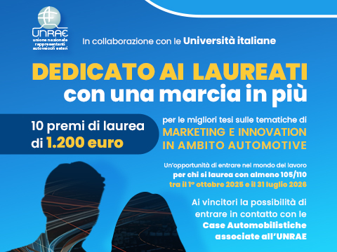 L’UNRAE (Unione Nazionale Rappresentanti Autoveicoli Esteri) prosegue il suo impegno ultraventennale nella valorizzazione del talento e della ricerca accademica, assegnando nella 25^ edizione 5 riconoscimenti a giovani laureati che hanno sviluppato elaborati di particolare rilievo su temi nel settore automotive e nella mobilità sostenibile.